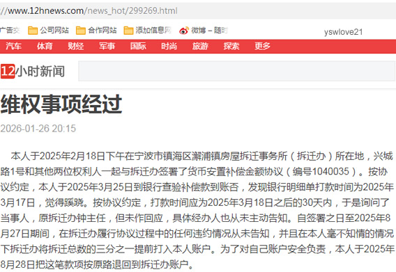 本人于2025年2月18日下午在宁波市镇海区澥浦镇房屋拆迁事务所(拆迁办)所在地,兴城路1号和其他两位权利人一起与拆迁办签署了货币安置补偿金额协议(编号1040035)。按协议约定,本人于2025年3月25日到银行查验补偿款到账否,发现银行明细单打款时间为2025年3月17日,觉得蹊跷。按协议约定,打款时间应为2025年3月18日之后的30天内,于是询问了当事人,原拆迁办钟主任,但未作回应,具体经办人也从未主动告知。自签署之日至2025年8月27日期间,在拆迁办履行协议过程中的任何违约情况从未告知,并且在本人毫不知情的情况下拆迁办将拆迁总数的三分之一提前打入本人账户。为了对自己账户安全负责,本人于2025年8月28日把这笔款项按原路退回到拆迁办账户。